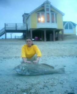 This 65 pound Grouper was hooked by this young lady, surf fishing in front of Three Mile Station.